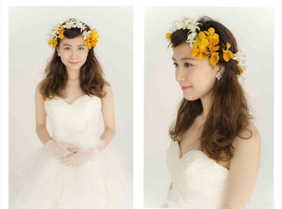 时尚看点:这款唯美新娘发型采用半扎公主头的扎发来展现出十足的优雅与甜美范儿,而两边那披肩的微卷头发更是散发出浓郁的浪漫与唯美感,加上黄白相间的花朵头饰搭配,瞬间让新娘美腻众人双眼。