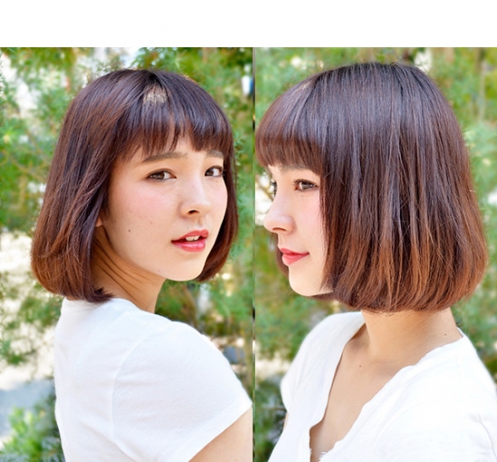 时尚看点:短直发给人的感觉本来就很乖巧,再搭配上一款刚好齐眉的齐刘海,瞬间让女生的整个可爱范儿UPUP,而那稍稍烫卷的内扣发尾更是倍增造型时尚与看点,最后加上浅棕色染发,不就更加的完美显萌萌哒啦。