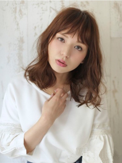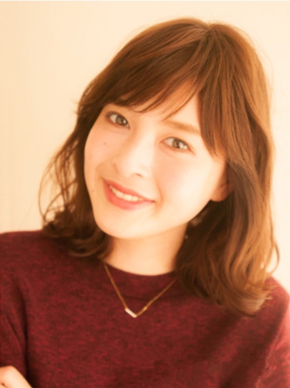 时尚看点:及肩微卷的头发搭配空气感刘海,轻松之间就能女生那清纯与甜美的一面尽显,搭配上浅棕色的染发就更是显清新自然了。