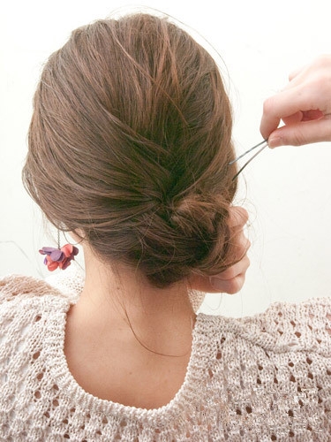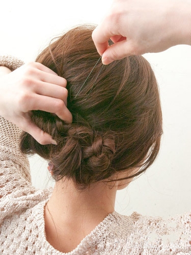 缠绕成发髻后用黑色小发夹固定好。