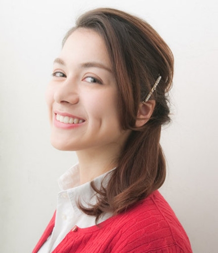 采用侧边内扣扎发设计的这款公主头发型可是尽显优雅甜美气质,搭配侧分露额头的长刘海,不仅起到修颜效果更是倍增几分优雅范,加上那时尚的发夹点缀下更是显俏丽动人魅力。