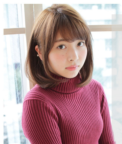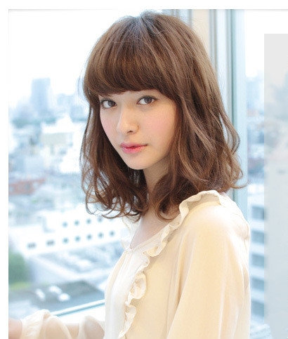 这款齐肩方脸发型搭配一款遮额头厚重刘海,不仅修饰方脸更是倍增几分mm萌度,而那荡漾在肩头的蓬松烫卷头发也可以很好的修饰方脸脸型哦,加上浅棕色的染发就更是减龄吸眼。