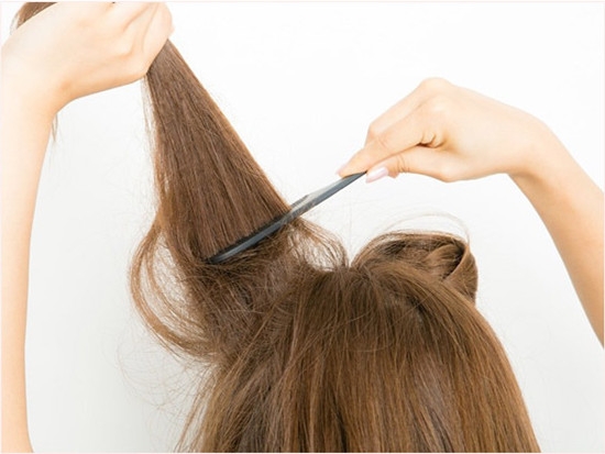 然后把两束猫耳朵的头发提起,并用同样的梳子将头发后面打出发丝来。