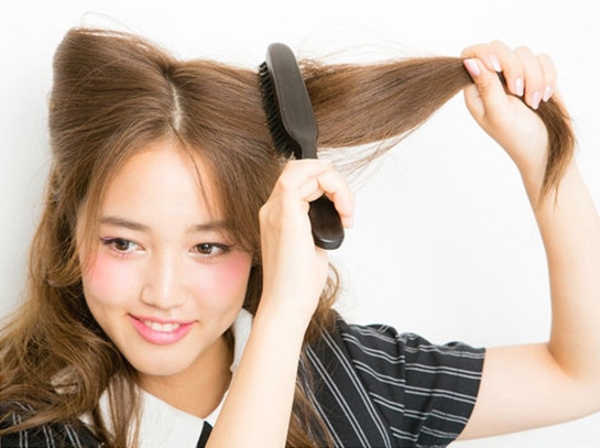 接着用按摩梳那样较为大齿的梳子,从前面梳顺猫耳朵的两束头发。