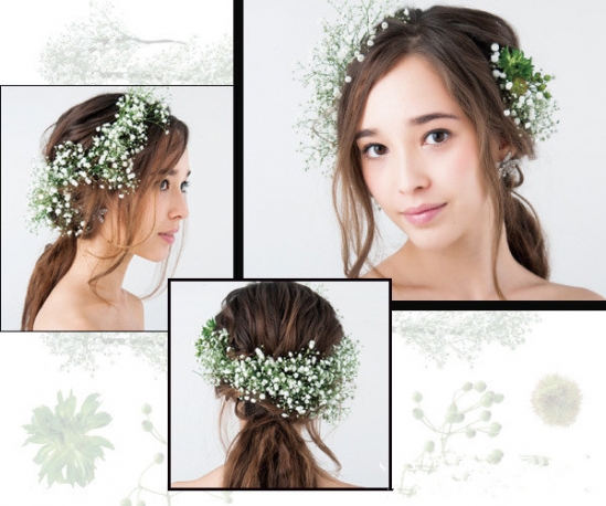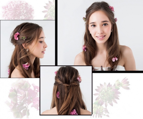 这款新娘发型采用花花草草随意点缀的设计可以让造型更加的清新甜美,再搭配简约的半扎发就是时尚好看了。