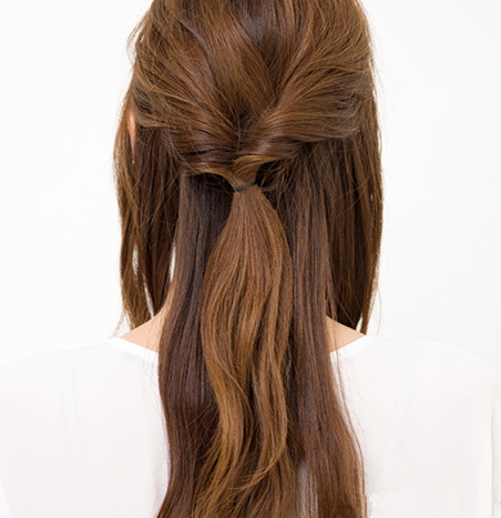 将头发自然散披,再从脑后选取两束头发扭转成发辫,然后用橡皮筋固定在一起。