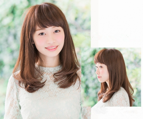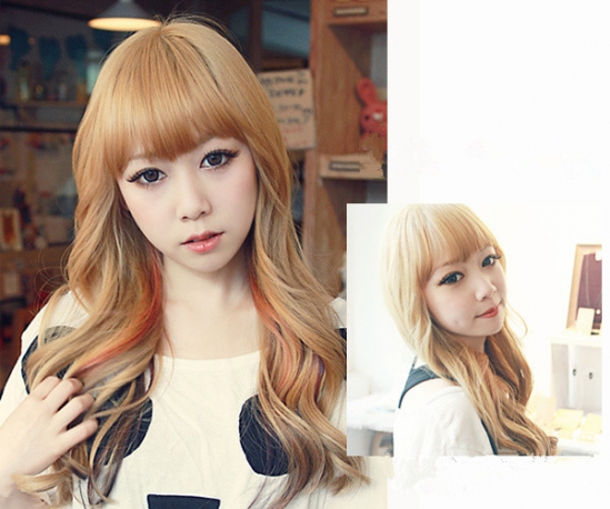 由亚麻黄作为主发色再搭配几根挑染金色发丝设计的这款长卷发定是潮女们的最爱,搭配上整齐的刘海尽显甜美可爱范儿,加上两边自然散落的烫卷弧度长发更是尽显十足的迷人气质。