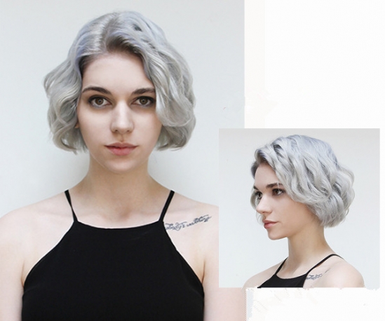 银灰色的这款女生短发造型尽显十足的潮流与个性范,把头发从额头位置开始波浪卷的短发突显出了清爽干练的味道,同时还带了几分欧美风的感觉。