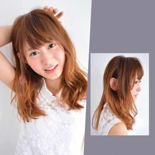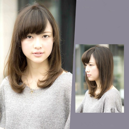 时尚看点:这款齐肩的中长发向人显露出十足的清纯与淑女的气息, 搭配上一款偏厚重的微微斜拨刘海,使得那光洁的额头得以显露,而那微微内扣的发尾自然散落在肩头,给人的感觉是那么的纯美与淑女。