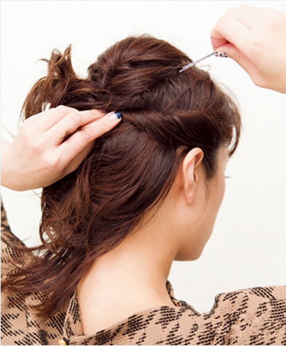 左右两鬓的头发向内卷,一直卷到后脑勺的中间用小发夹固定好。