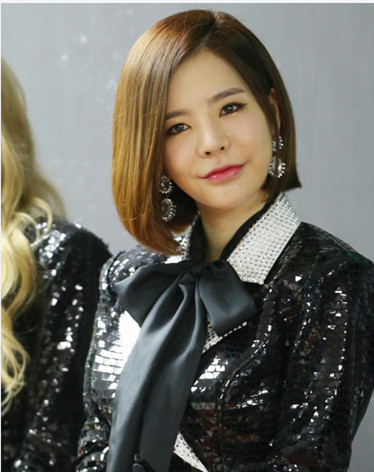 少女时代李顺圭这款浅亚麻色的lob发型显得十分的甜美,刘海到内扣发尾的弧度起到很好的修饰脸型效果,让脸部线条显得更柔和,再配上时尚的棕色染发就更是吸眼了。