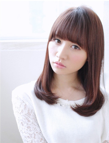 发型点评:浅棕色染发的这款小脸圆脸发型看起来非常的清新甜美,那内扣及眼齐刘海搭配中长直发遮盖额头跟脸颊,使小圆脸在视觉上会变小一些,同时也能让妹子更加显清甜气质。
