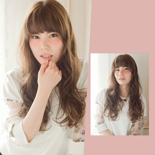 微微烫弯齐刘海搭配的这款菱形脸长卷发看起来非常显清新味道,将上部分的头发烫成起伏较小的“之字形”卷发,而发尾汤成成蓬松大卷的样子,然后再沿着脸颊自然滑落与胸前,轻松就能将菱形脸修出一张小脸来。