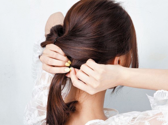 从耳朵位置将头发分上下两部分,分别用橡皮筋绑成马尾。