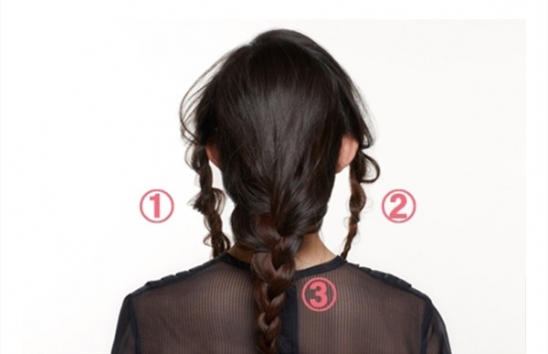 先将后脑勺的头发与两侧的头发分别编成3个3股辫,并用橡皮筋固定好。