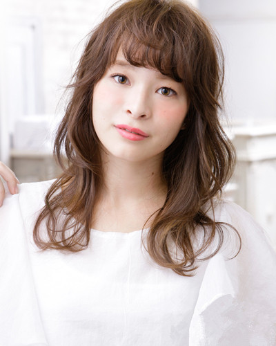 中长卷发搭配空气感齐刘海可以遮挡住窄额头的缺陷,让脸部轮廓看上去更加的协调,将头发采用时尚感的荷叶头烫卷发配上暖暖的棕色调染发,既起到修颜效果又让女生看上去更加温婉可人。