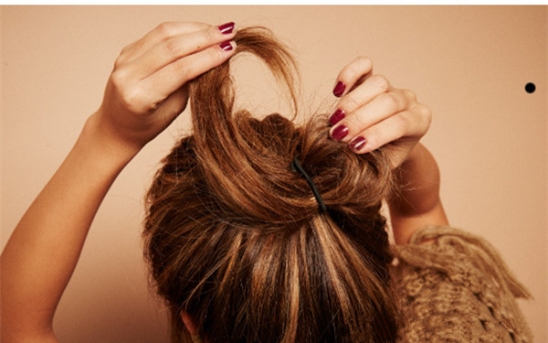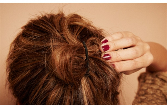 再将发尾对折塞进橡皮筋中固定好,就可以完成这款慵懒高耸丸子头了。