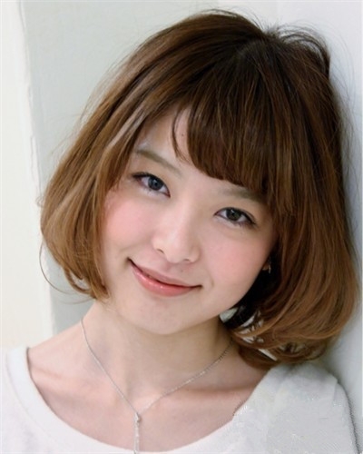 微斜的刘海与蓬松内扣烫卷的短发搭配,立马讲胖脸与圆脸打造出柔美甜蜜的小脸蛋,再加上轻柔的染色效果,既能衬托白皙皮肤的作用又能UP时尚感。