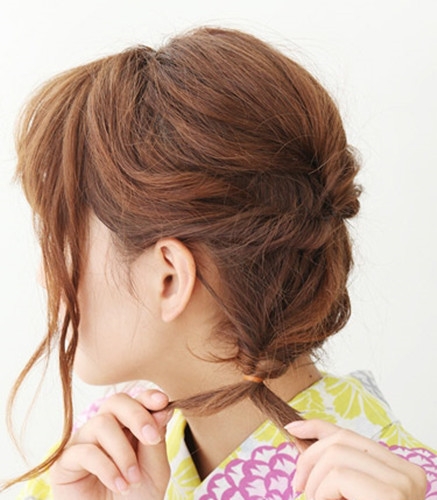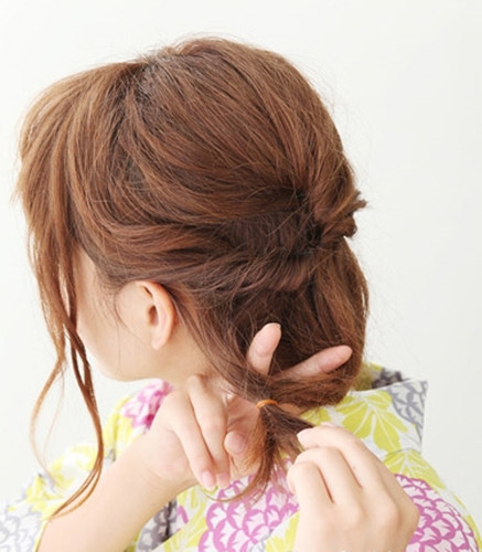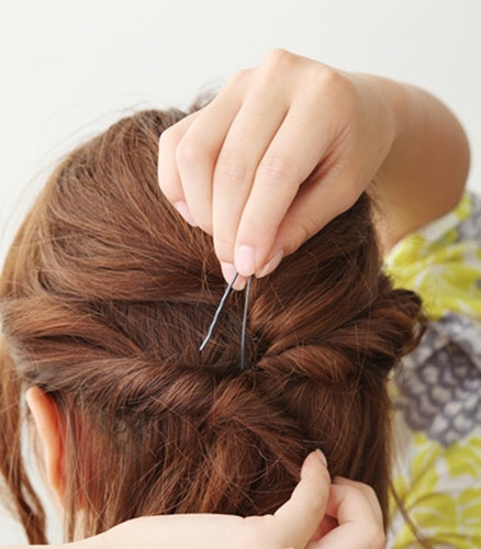 再依次取出下方的头发扭转,也有黑色小发夹固定在脑后。
