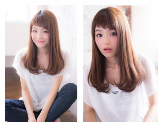 发型点评:同样用以不对称的短刘海配内扣中长发直发的这款发型,却给人不一样的视觉感觉哦,加上棕色的染发与乏发尾内扣的设计,轻松之间就能带了甜美时尚感与一张可人鹅蛋脸。