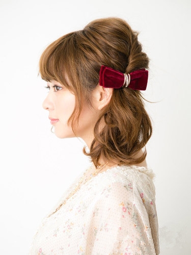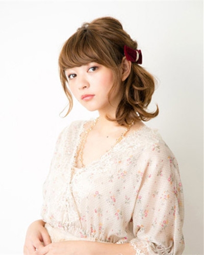 时尚看点:简单扭转发辫打造的这款扎发造型,搭配一款厚重出卷翘的弧度的刘海,修饰脸型之余还带出灵动双眸,搭配脸颊脸庞卷翘的长发尽显甜美可爱,最后加上酒红色的蝴蝶结发饰点缀,使其低调中散发出华丽气质。
