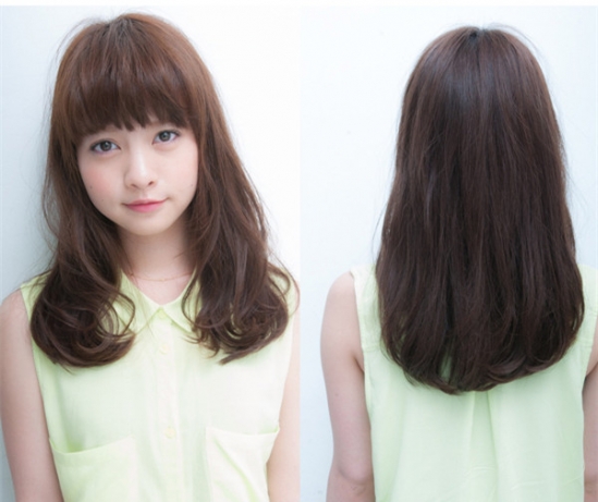 发型点评:齐刘海搭配的这款中长发发型,让女生那张可人的鹅蛋脸完美显露,再将浅棕色染发的柔顺头发自然散披在肩头,瞬间就能散发出清甜与唯美的气息。