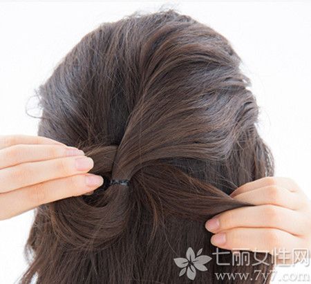先将太阳穴上方的头发用橡皮筋半扎在后脑中间,并将马尾从中间扭卷两圈。