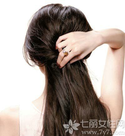 首先用手指将头发随意分成上下两部分,再挑出上面的头发汇集于脑后中央。