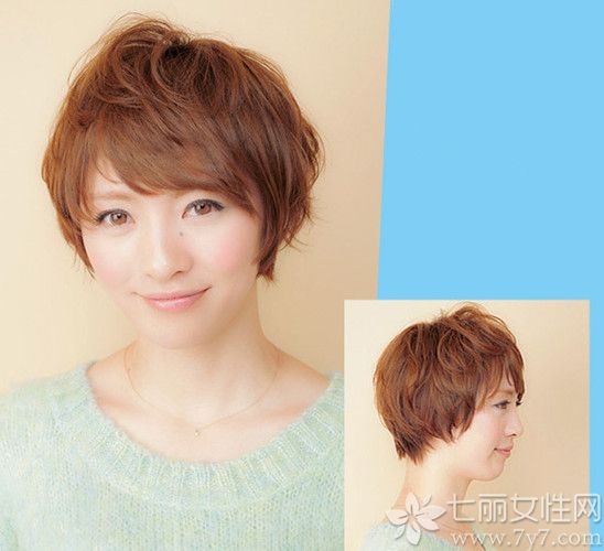 棕色染发的这款齐耳短衬托出女生粉嫩嫩的白皙脸蛋,采用纹理烫效果让短发尽显立体感,加上潮流的设计造型就更显中性帅气风味了。