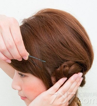 再将辫子缠绕成花朵造型后用黑色小发夹固定。
