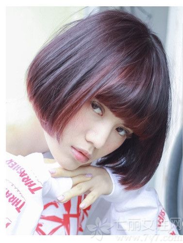 发型点评:采用整齐的二次元刘海与红色挑染短发搭配,瞬间就张扬出十足的个性与潮女风范,加上两边层次感裁剪设计的头发搭配,既助妹子瘦脸又多了几分可人气息。