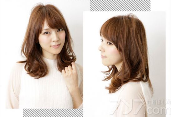 这款清新甜美的中长卷发也是蛮适合鹅蛋脸的妹子的,秀发不会过于贴紧脸颊地自然飘逸,可以突出这种脸型特有的美感。