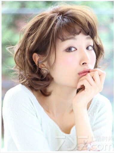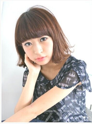 发型点评:整齐刘海与短发搭配的这款大脸发型,不仅突出mm明亮的大眼睛更是可爱至极,再将发尾进行微微的外翘烫卷设计,轻松为整个造型倍增俏皮感。