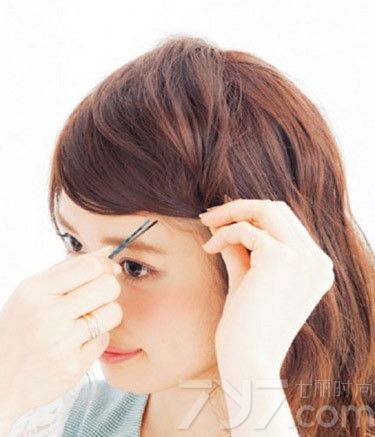 取出前额的刘海扭转后用黑色小发夹固定好。