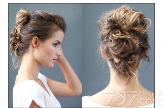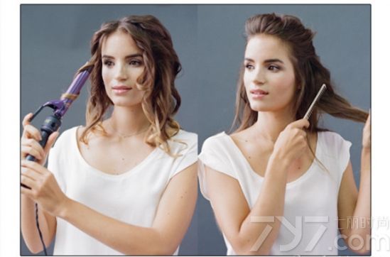 首先用加热的卷发棒将头发烫出蓬松的效果,卷接着把头顶头发向后扎起,而两侧头发用梳子轻轻梳理。