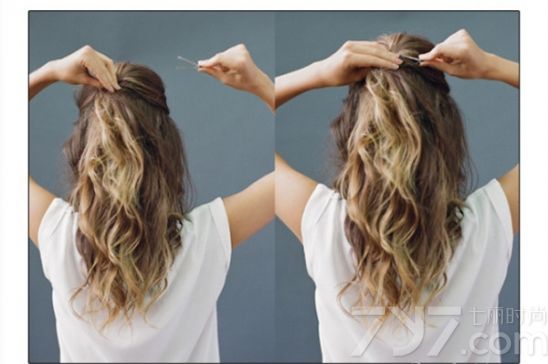 把头发放下,然后把两侧的头发用夹子固定在脑后。