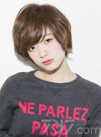 时尚看点:秀气十足的这一款韩式齐耳短发发型让女生看起来非常具有清新范儿,搭配厚重的斜刘海可以遮住额头修饰脸型,再配上棕色发色搭配就更显时尚吸睛了。