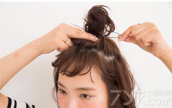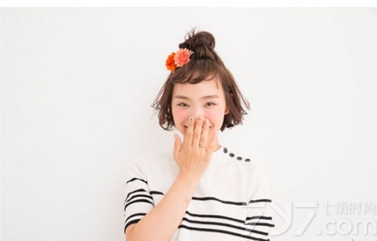 时尚看点:高半扎丸子头的这款短发发型一样也十分的甜美可人,高扎的方法可以让妹子们尽显清爽感之余,还倍添个性气质,加上朵发饰点缀后就更加个性吸睛。