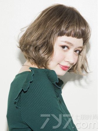 发型点评:亚麻色的这款短发波波头给人十足的活泼的俏丽感,将厚重的发尾烫卷成丰满的卷翘的样子,不仅彰显出时尚感更是能修饰脸型,再配上一款不规则的眉上刘海就更是显得个性搞怪气质。