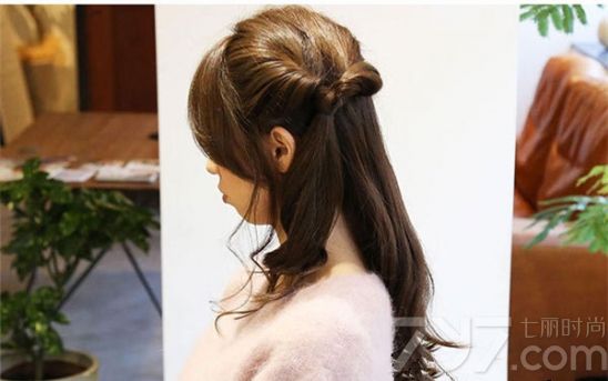 将上面的马尾斜拉到一侧耳上,然后向上翻折扭卷;之后再将下面扎的马尾松掉。
