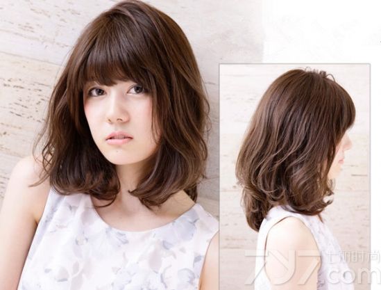 时尚看点:齐刘海内扣设计的这一款齐肩发型能突出妹纸的闪闪大眼,加上及肩蓬松烫发的处理可以让脸型在视觉上修颜效果,同时也能让妹子的发量看起来多一些。