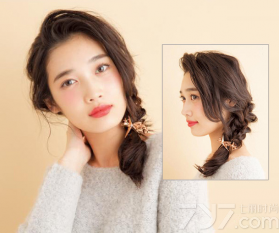 时尚看点:侧边麻花辫编发的这款发型展现出独特的魅力气息,蓬松的编发搭配星星发夹可以让真个造看起来更加精美动人,加上弧度设计的刘海搭配就更具有独特范儿了。