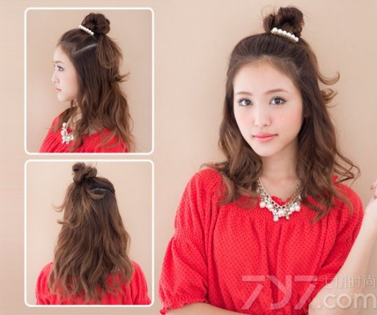 时尚看点:这款清爽的无刘海扎发发型让妹子尽显精神气爽,只需简单的将刘海与头顶上不部分的头发扎成小发团就可以了,再配上自己喜欢发饰点缀就更加的吸睛与美腻了。