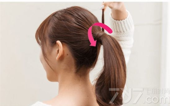 在马尾中取一小束头发,然后缠绕扎发橡皮筋并用黑色小发夹固定好。