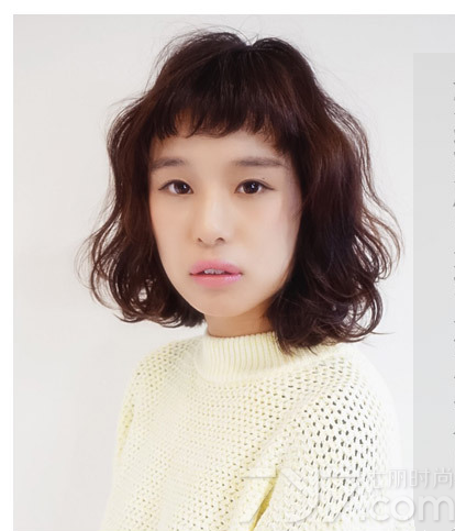 发型点评:简短的内扣齐刘海让人看来十分的个性与俏皮,搭配上一款蓬松效果的短卷发,既让妹子在视觉上具有显脸小作用又整个造型更加的减龄有范。