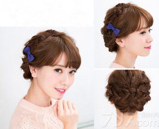 时尚看点:三股辫子设计的这款盘发发型可谓优雅气质十足。从脑后看,可以清晰的看到三股辫子的纹理,显得特别的精致与设计感;从前面看,微微内扣的大刘海的让个妹子尽显甜美范儿,最后再配上精美的蝴蝶结发饰点缀,岂不是更加美腻了。