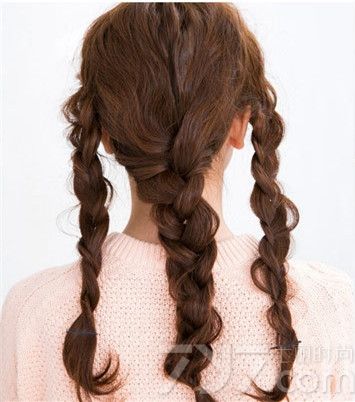 先将头发先分成三部分,分别是左右两边与中间,然后将三个分的头发编织成三股辫子并用橡皮筋和发夹固定。