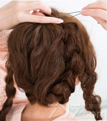 将中间的辫子向上扭转,并用黑色小发卡固定在脑后。