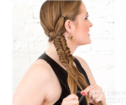 接着用橡皮筋把两个小马尾扎在一起成一个大马尾。然后在大马尾中取一小股一小股秀发开始编织鱼尾辫,尽量编织得紧密一点。