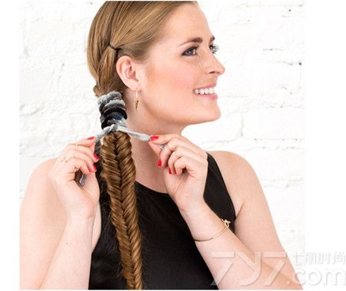 最后选一款漂亮的发圈或发饰,在辫子上方缠绕几圈以盖住橡皮筋显得更美观,这样就可以完成这款鱼骨辫编发了。